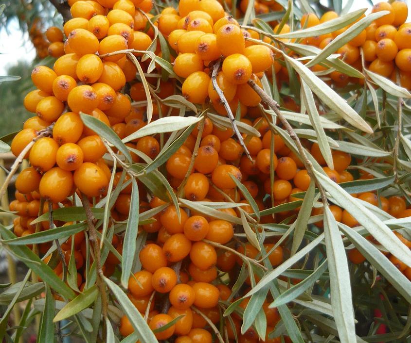 Обліпиха Великан – середньорослий сорт раннього строку достигання. Кущ досягає 3м у висоту, має овальну крону невеликих розмірів з міцними гілками. Плоди крупні, середньою масою до 1,2г, оранжеві, злегка видовженої форми. М’якуш кисло-солодкий, злегка терпкий, соковитий. Морозостійкість сорту висока. Надає перевагу супіщаним родючим грунтам, сонячним ділянкам, росте у напівтіні.